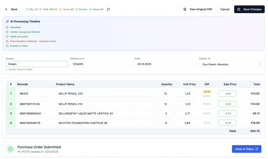 Duo Cosmetics faced exactly this challenge. With multiple warehouses and a large vendor base, their finance team was spending significant time manually reviewing PDF invoices, extracting data, and entering it into their ERP. Traditional automation tools based on templates and fixed rules failed to handle the variability.